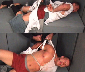 briefs. He then proceeds to oil up the struggling bodybuilder,