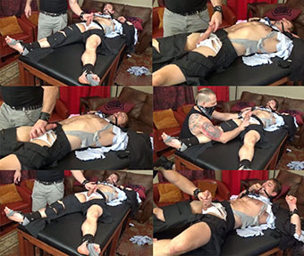 Now exposed and vulnerable, with his cock still sporting an embarrassing erection, the young intern lay helplessly as the demented doctor started to stroke his cock. The poor young man was unable to hide his arousal in spite of his predicament, and he was deeply ashamed. The man took him to the brink or orgasm, then walked away to let him cool off, before coming back to take his cum. When the young man had finished ejaculating, the doctor milked his sensitive cock to torment him some more. |
