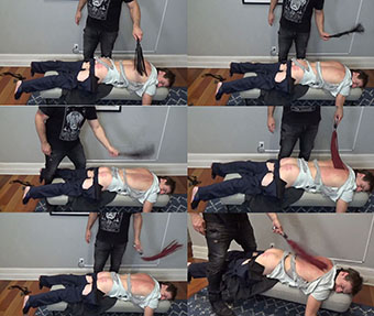 Now the cocky rider was bound and gagged face down, his back and butt exposed, and the driver started a vicious whipping with relentless hard strokes. The rider groaned and his body flinched with every blow. The driver continued until the rider’s back was red and raw and he was squealing and whimpering, hen sobbing softly by the time his whipping was finally over. |
